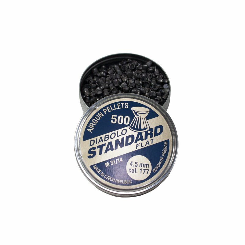 Die Kovohute Pribram Standard Diabolos im Kaliber .177 (4,5 mm) bestechen durch eine recht gute Präzision und Durchschlagskraft. Die Standard Diabolos eignen sich für sportliches Schießen und den Freizeitbereich und erzielen hier sehr gute Trefferergebnisse im Bereich von 10 m. Das flache Geschoss aus Blei besitzt einen geriffelten Kelch und ein Geschossgewicht von 0,5 Gramm. Bitte beachte das flache Geschosse recht anfällig für Wind sind, daher sind sie für Außenanwendungen nur bedingt geeignet.